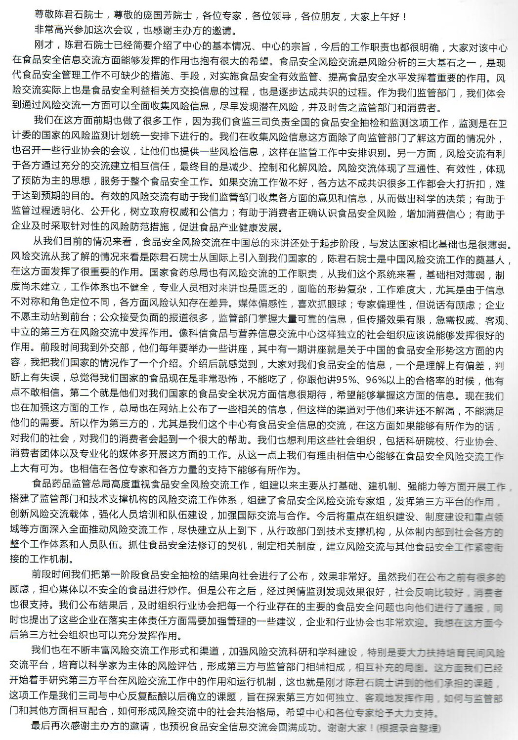 國家食品藥品監管總局于軍司長在食品安全信息交流會上講話