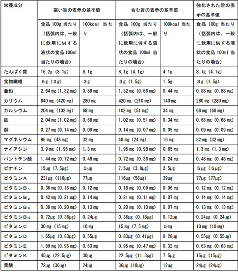 表2中列舉了聲稱“富含”、“含有”、“強(qiáng)化”的營養(yǎng)成分含量基準(zhǔn)值。蛋白質(zhì)和膳食纖維的強(qiáng)化聲稱,其含量高于強(qiáng)化基準(zhǔn)值以上的同時(shí),與其他產(chǎn)品保持25%以上相對差,所以適用新法之后聲稱“與我公司以往產(chǎn)品相比蛋白質(zhì)含量提高了20%”是不合法的。