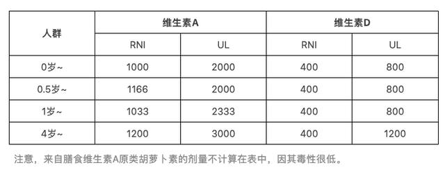 所以,適當補充維生素A也是可以的。我國對維生素A的推薦攝入量(RNI)和最大耐受量(UL)也都做出了評估,只要在這個量之間,都認為是安全的。