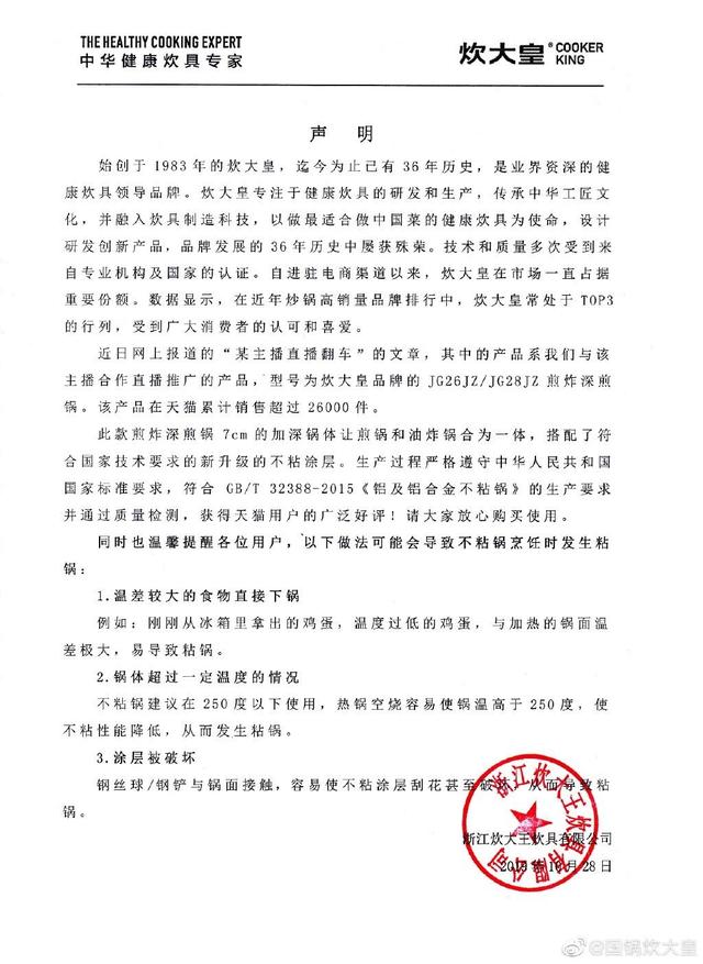 網(wǎng)紅翻車(chē)后,不粘鍋公司回應(yīng)稱(chēng)是因?yàn)橹鞑ゲ粫?huì)做飯,演示時(shí)沒(méi)有放油、雞蛋從冰箱冷藏拿出來(lái),溫差太大,鍋的溫度太高;并在聲明中稱(chēng)用來(lái)直播的鍋鍋符合GB/T 32388-2015《鋁及鋁合金不粘鍋》的生產(chǎn)要求并通過(guò)質(zhì)量檢測(cè)。主播的工作室則回應(yīng),推薦產(chǎn)品沒(méi)問(wèn)題,粘鍋原因不便回復(fù)。