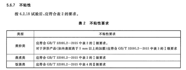 標(biāo)準(zhǔn)GB/T 32388-2015《鋁及鋁合金不粘鍋》中對(duì)鍋的不粘性要求是要符合GB/T 32095.2-201 《家用食品金屬烹飪器具不粘表面性能及測(cè)試規(guī)范 第2部分:不粘性及耐磨性測(cè)試規(guī)范》中表2的I級(jí)要求。