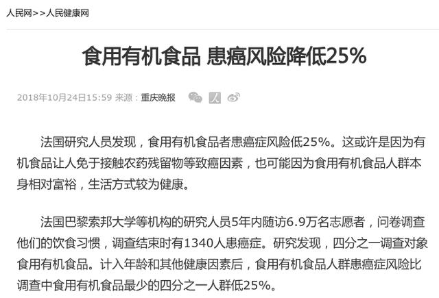 大量在媒體在報道時稱,食用有機食品 患癌風險降低25%。甚至一些說法說吃有機食品能預(yù)防癌癥。