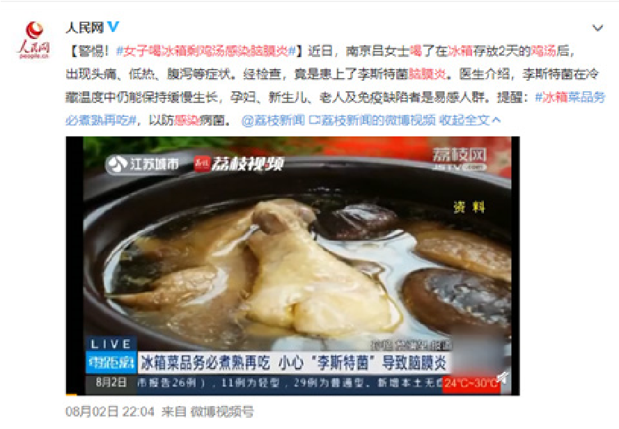 近日,南京呂女士喝了在冰箱存放2天的雞湯后,出現(xiàn)頭痛、低熱、腹瀉等癥狀。經(jīng)檢查,竟是患上了李斯特菌腦膜炎。