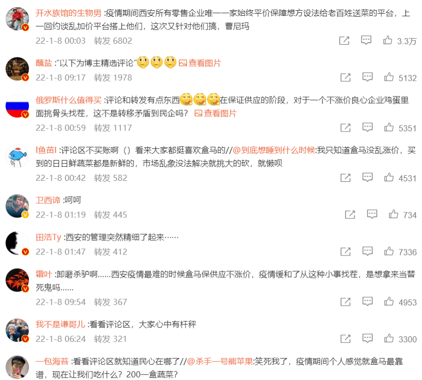 然而,評論區卻翻車了。網友幾乎一邊倒的罵監管部門,包括一些很有影響力的大 V。很顯然,在西安封城期間盒馬鮮生不漲價、保供應是贏得了民心的。但是,你真覺得盒馬沒問題?