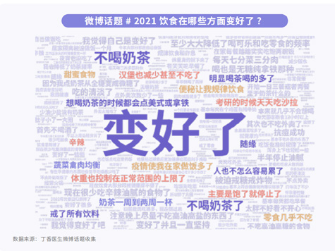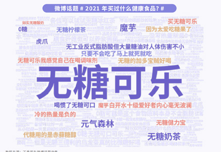 第三,2021的食品熱詞是“無糖飲料”,人們提到買得最多的品類是無糖飲料。而很多人開始選擇“無糖飲料”,其實也跟身材困擾有關,不少人因為認為“無糖飲料”能減肥、能幫助自己緩解身材困擾。