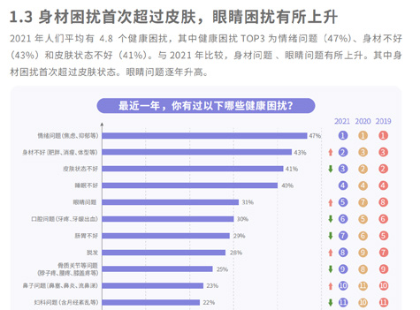 第二,在各類健康困擾中,人們對身材的關注首次超過皮膚,排名第二,這其中主要是肥胖相關的身材困擾。