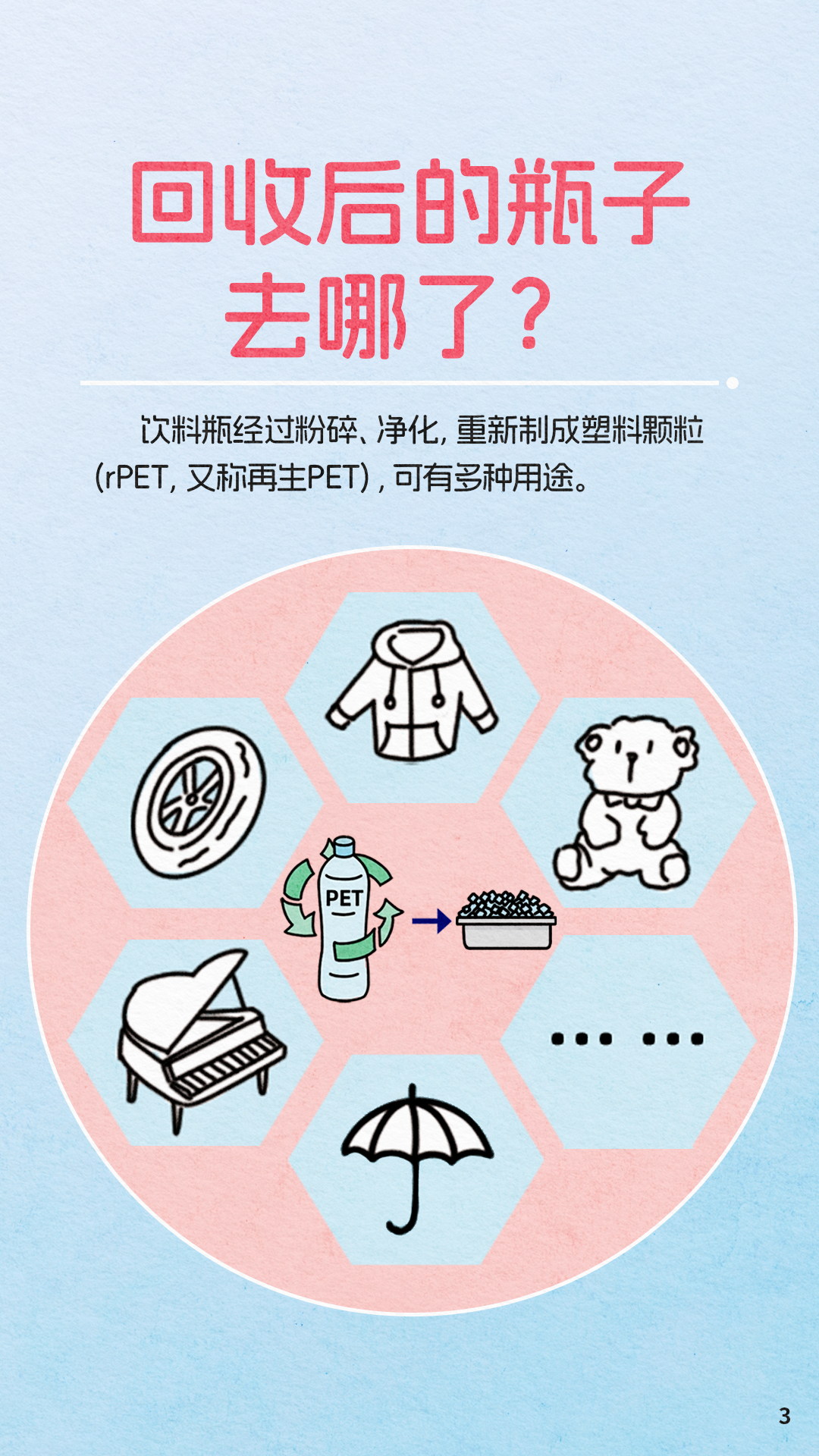 它會變成衣服帶給你溫暖,變成毛絨玩具陪伴孩子童年,變成雨具守護你的出行,變成潮鞋配最靚的仔……它還能重回食品包裝,實現碳減排。一起來看看飲料瓶的重生之路吧!