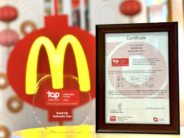 2023年1月17日,上海,麥當勞中國獲得由杰出雇主調(diào)研機構(gòu)(Top Employers Institute)頒發(fā)的中國杰出雇主 2023認證。麥當勞中國以綠色增