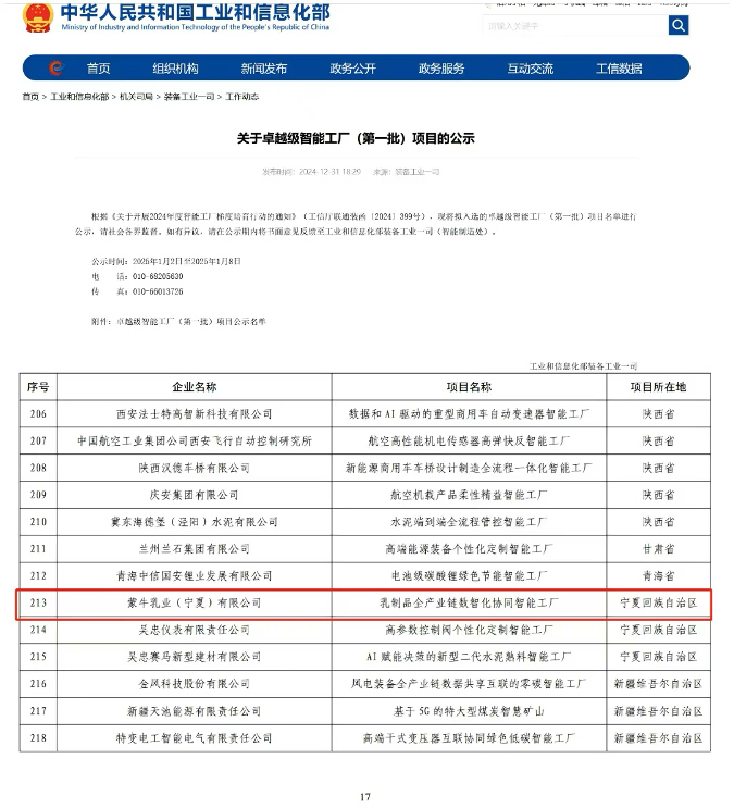 國家級認可!蒙牛寧夏工廠入選工信部首批卓越級智能工廠