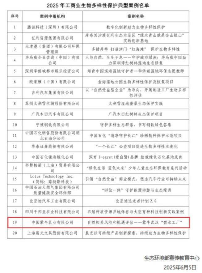 生態(tài)環(huán)境部宣傳教育中心公布了 2025 年工商業(yè)生物多樣性保護(hù)典型案例,蒙牛乳業(yè)《自然相關(guān)風(fēng)險(xiǎn)和機(jī)遇評估——蒙牛武漢“碧水工廠”》案例成功入選。這是乳品行業(yè)唯一獲評項(xiàng)目,彰顯了蒙牛在可持續(xù)發(fā)展領(lǐng)域的行業(yè)標(biāo)桿地位。